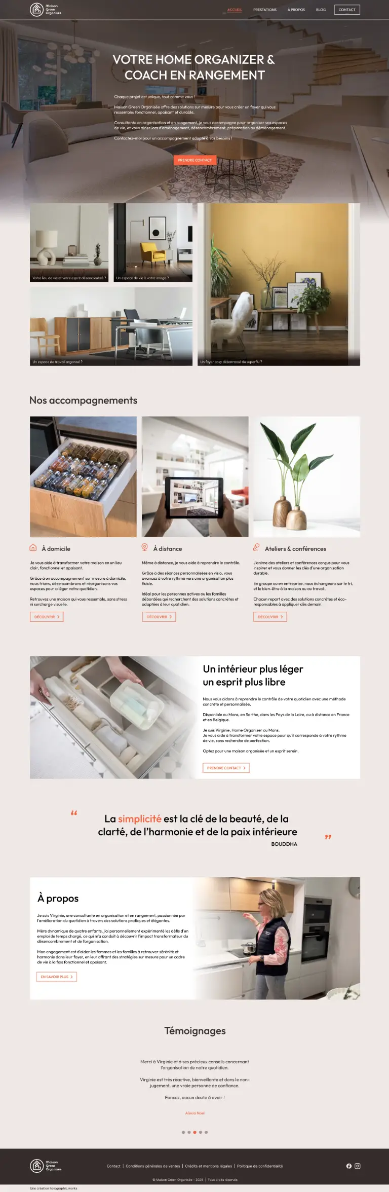 Le design web du site de Maison Green Organisée a été conçu pour traduire visuellement les valeurs de clarté, de sérénité et d’efficacité qui caractérisent le travail d’organisation intérieure.